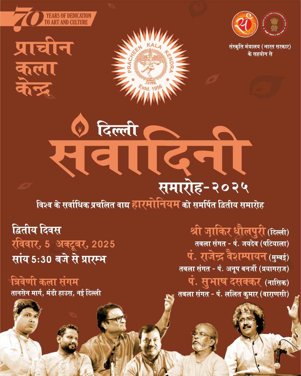 After a successful & house full Day 1 of Pracheen Kala Kendra’s Delhi Samvadini Samaroh 2025, we extend warm welcomes to join us for day two to experience the brilliance of three more extraordinary performances on Harmonium: